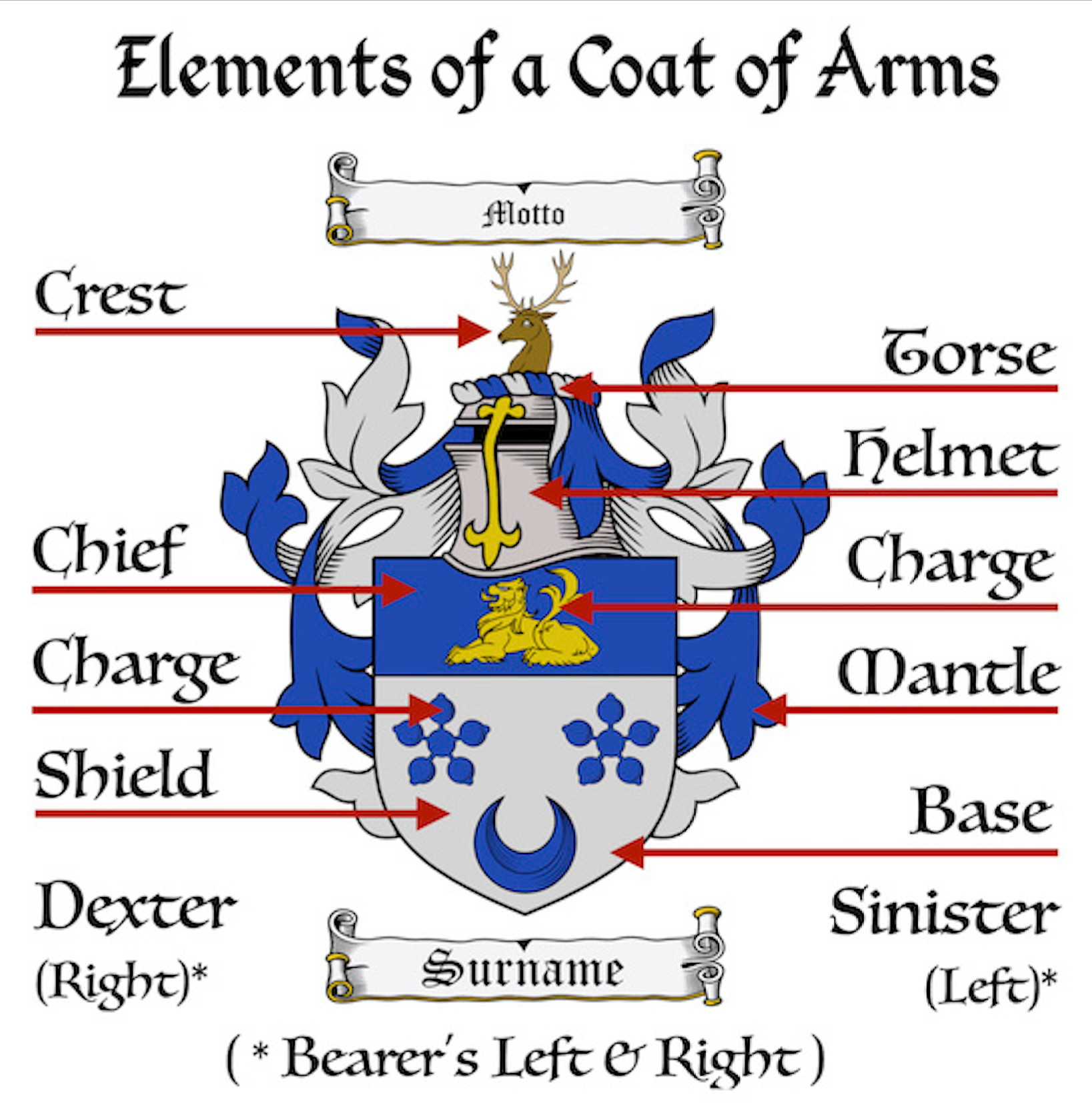 At its center is the shield, which carries the main symbols of the design. Above the shield sits the helmet, often crowned with a crest, the emblem that represents leadership or honor. Flowing from the helmet is the mantling, a decorative cloth that once protected armor from sunlight.